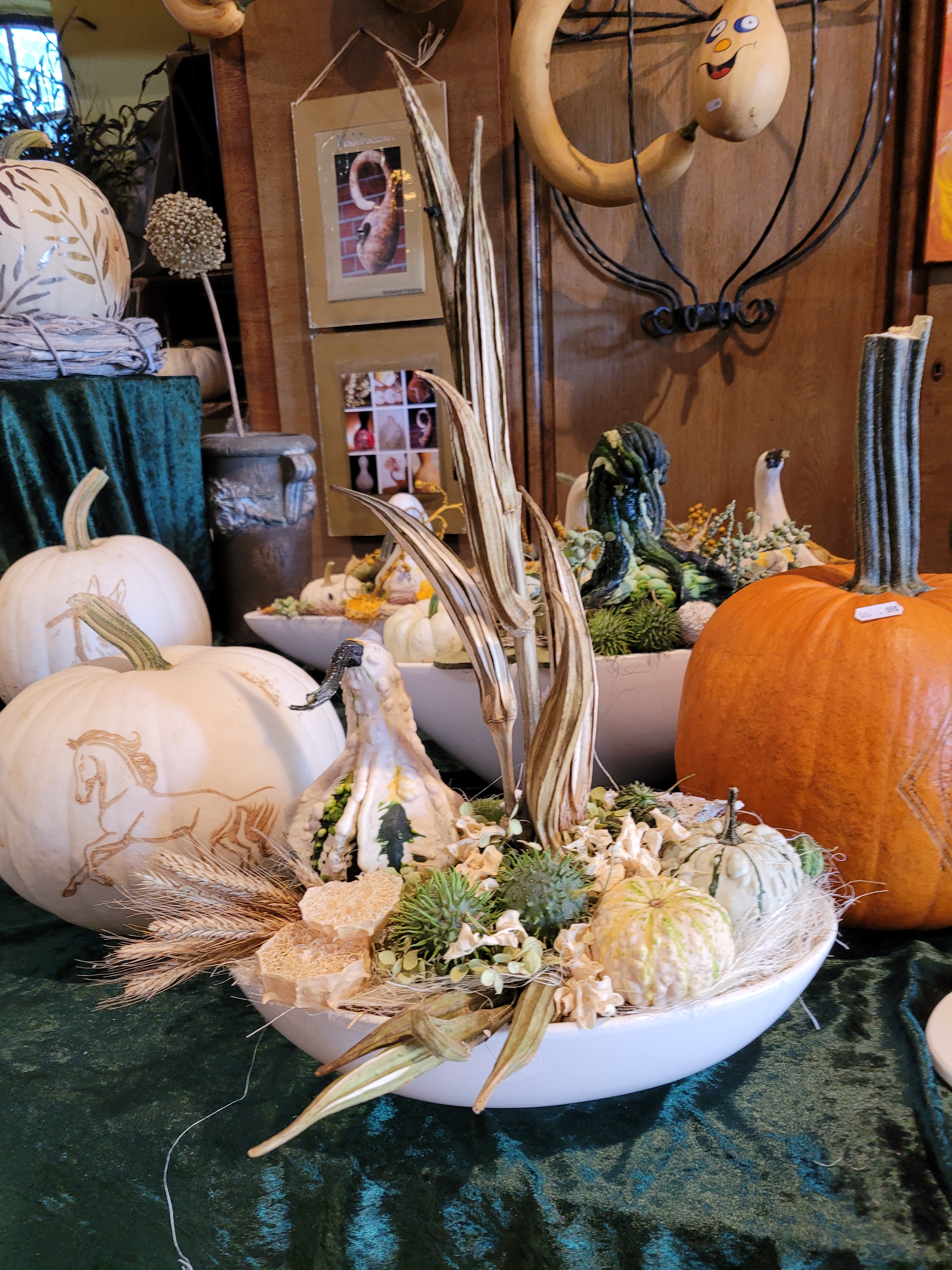 Floristik Gestecke, Körbe und dekorierte Kürbisse ergänzen das Sortiment im Hofladen Gerne stellen wir Ihnen Dekorationen zusammen oder fertigen Ihre individuellenWünsche an.