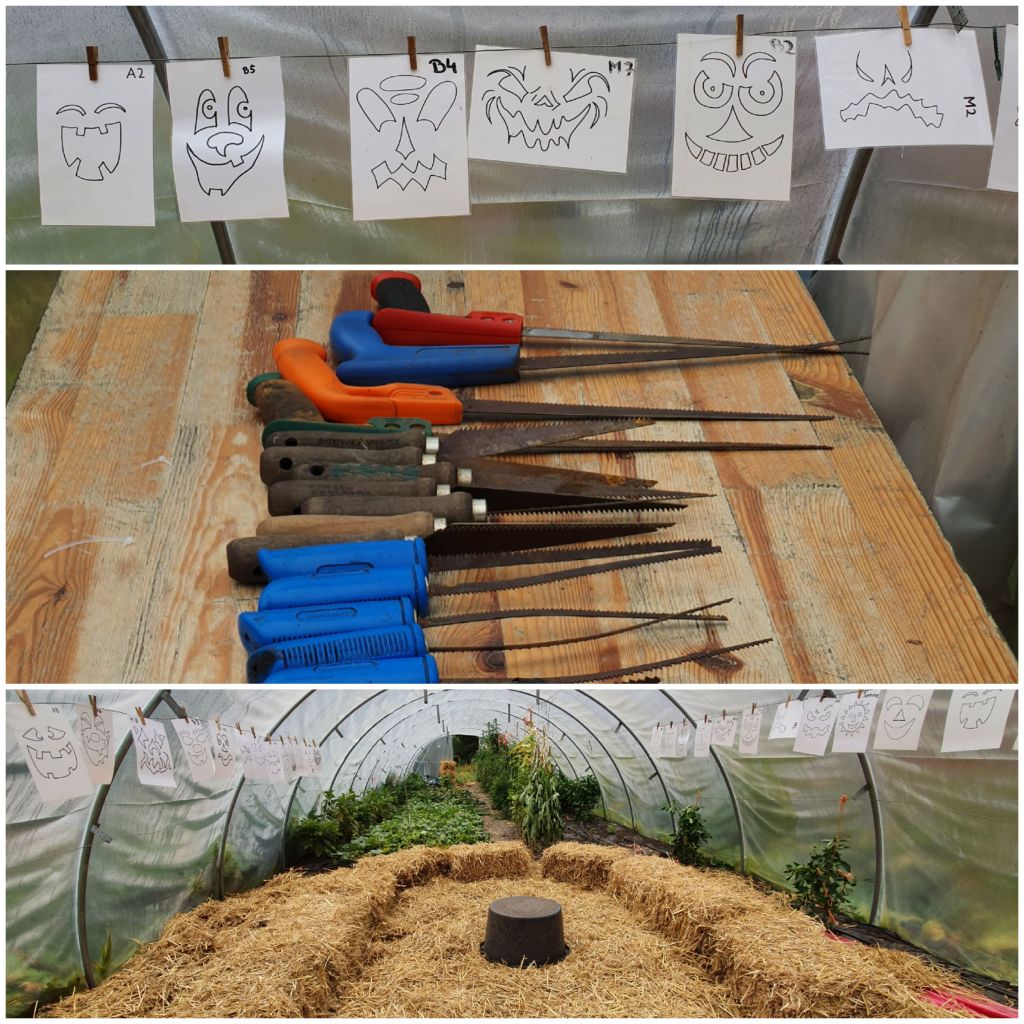 in gemütlicher Picknickatmosphäre im warmen und trocknen Gewächshaus auf Strohballen Ihren Kürbis zu einem kleinen Kunstwerk.